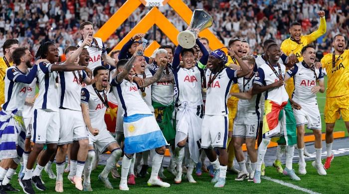 Tottenham Hotspur's South Korean forward Son Heung-min raises the trophy as he celebrates with teammates winning the UEFA Europa League final football match between Tottenham Hotspur and Manchester United at San Mames stadium in Bilbao on May 21, 2025. — AFPBILBAO: Brennan Johnson's... https://ift.tt/kvyUisd