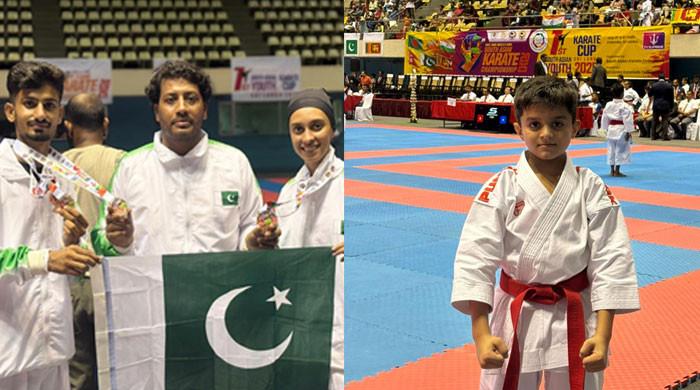Pakistan’s Under-10 gold medallist Huzaifa Arshad poses with fellow medal-winning karatekas and the national flag after securing medals in various categories. — ReporterPakistani athletes earned a total of nine medals at the South Asian Karate Championship in Colombo on Sunday,... https://ift.tt/CINhLnd