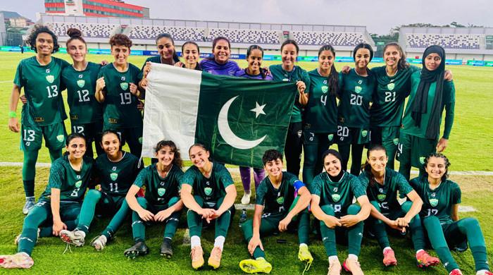 Pakistan's national women's football team poses with the national flag in this undated image. — ReporterKARACHI: Pakistan's women's football team concluded their AFC Women's Asian Cup qualifying campaign with a spirited 2-1 victory over Kyrgyzstan at the Sport Center Kelapa Dua Stadium in... https://ift.tt/u2KrHic